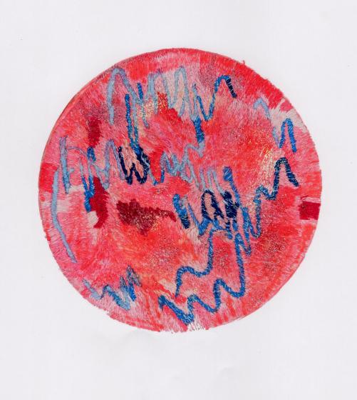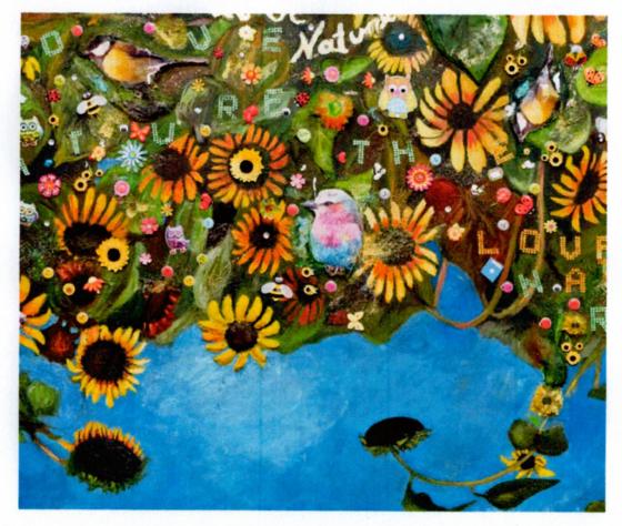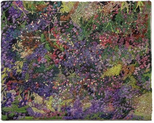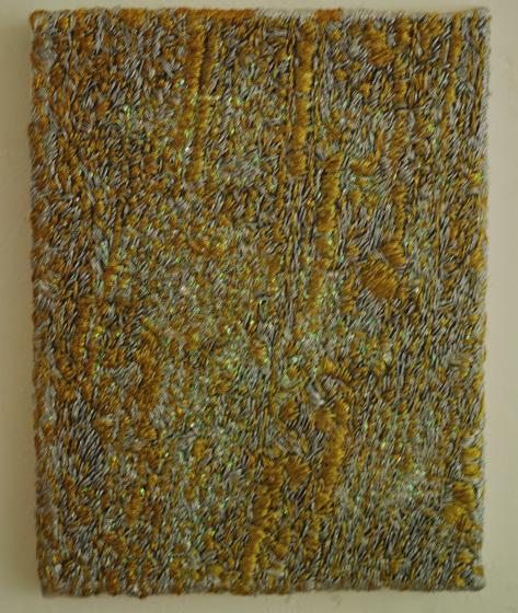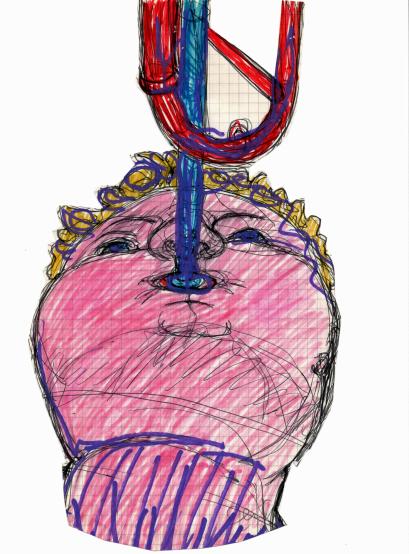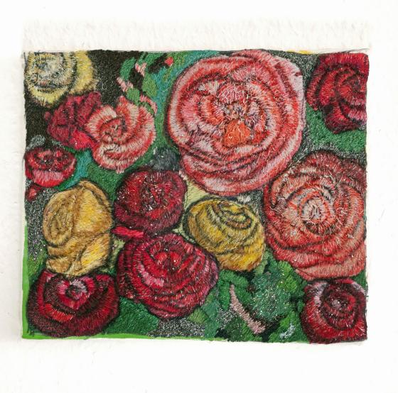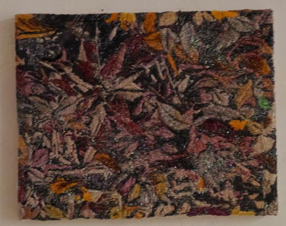 Aus der hinteren Ecke klimpert eine elektrische Spieluhr, die in einem gepunkteten Clown steckt, der herzergreifend monoton seinen Kopf kreisen läflt. Auf dem Rücken ist ihm eine Entlüftung implantiert, welche die durch den Motor erzeugte Wärme herausbläst. Wenn man die Hand auf diese Ventilation des Clownes legt, ist man an das warme Wabbern einer elektrischen Vagina erinnert. Die Wände sind üppig mit riesigen, farbenprächtig bestickten und bezeichneten Tuchbildern übersäht. diese Fülle ist bedrängend, aber nie aufdringlich.