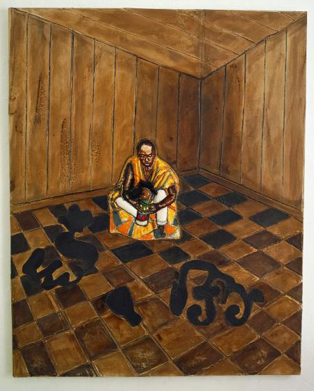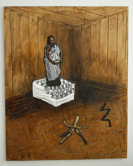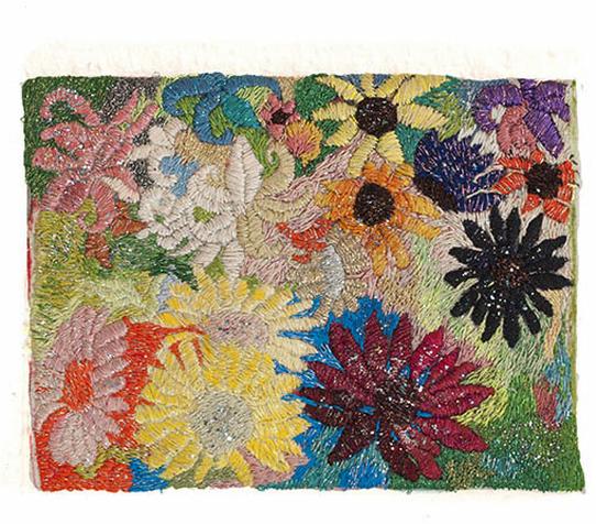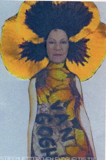 Zenner forms these cartoon characters from stuffed blankets or creates batik patterns.In one work she crocheted the figure of a Pakistani flower vendor onto a white fabric so that his dark hands and the flowers shine more brilliantly. One special work, "John the Baptist", 1992 was dedicated to a friend from ghana, who appears three times in this triptych. His variegated portraits rise off the white background almost like a relief. Partially clothed in a velvet cloak in one, partly sewn into the background and surrounded with the halo of a saint in another, he looks like a holy man from a far-off-continent.